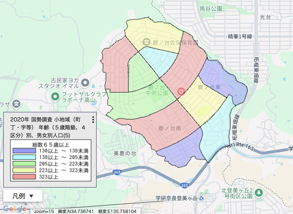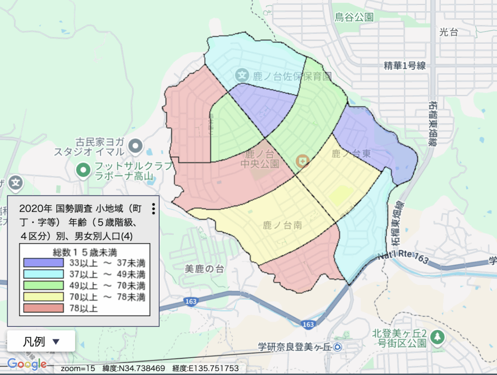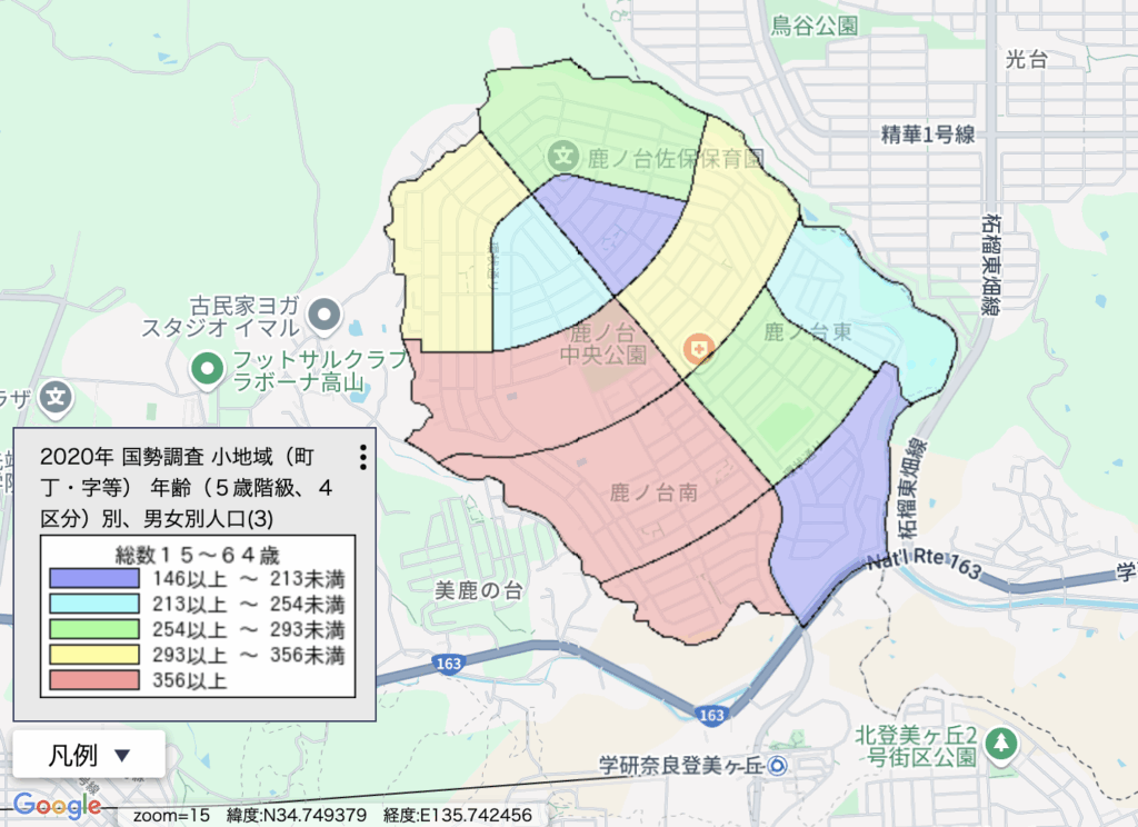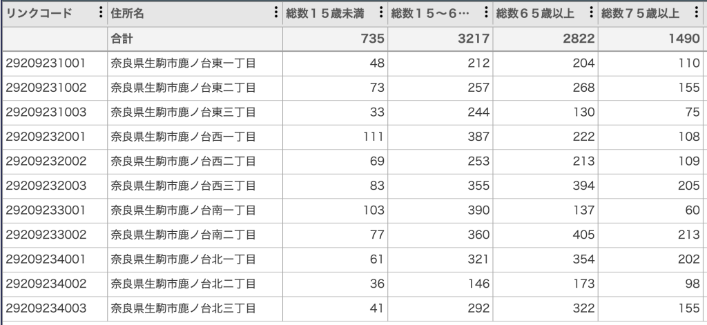 ③ 「集計地域」が「小地域」、 「集計範囲」を「行政界指定」、「都道府県」を「奈良県」、「市区町村」を「生駒市」と選択、「一覧から選択」で「鹿ノ台」の地域を選択