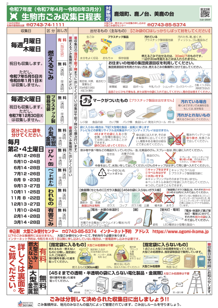 令和7年度(2025年4月〜2026年3月)の生駒市「ごみ収集日程表」(鹿畑町、鹿ノ台、美鹿の台地区)です。
